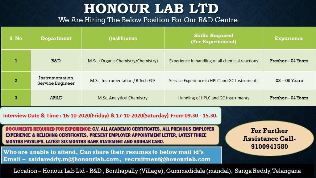 Honour Laboratories Limited - Walk-In-Interview on 16 & 17 October 2020
